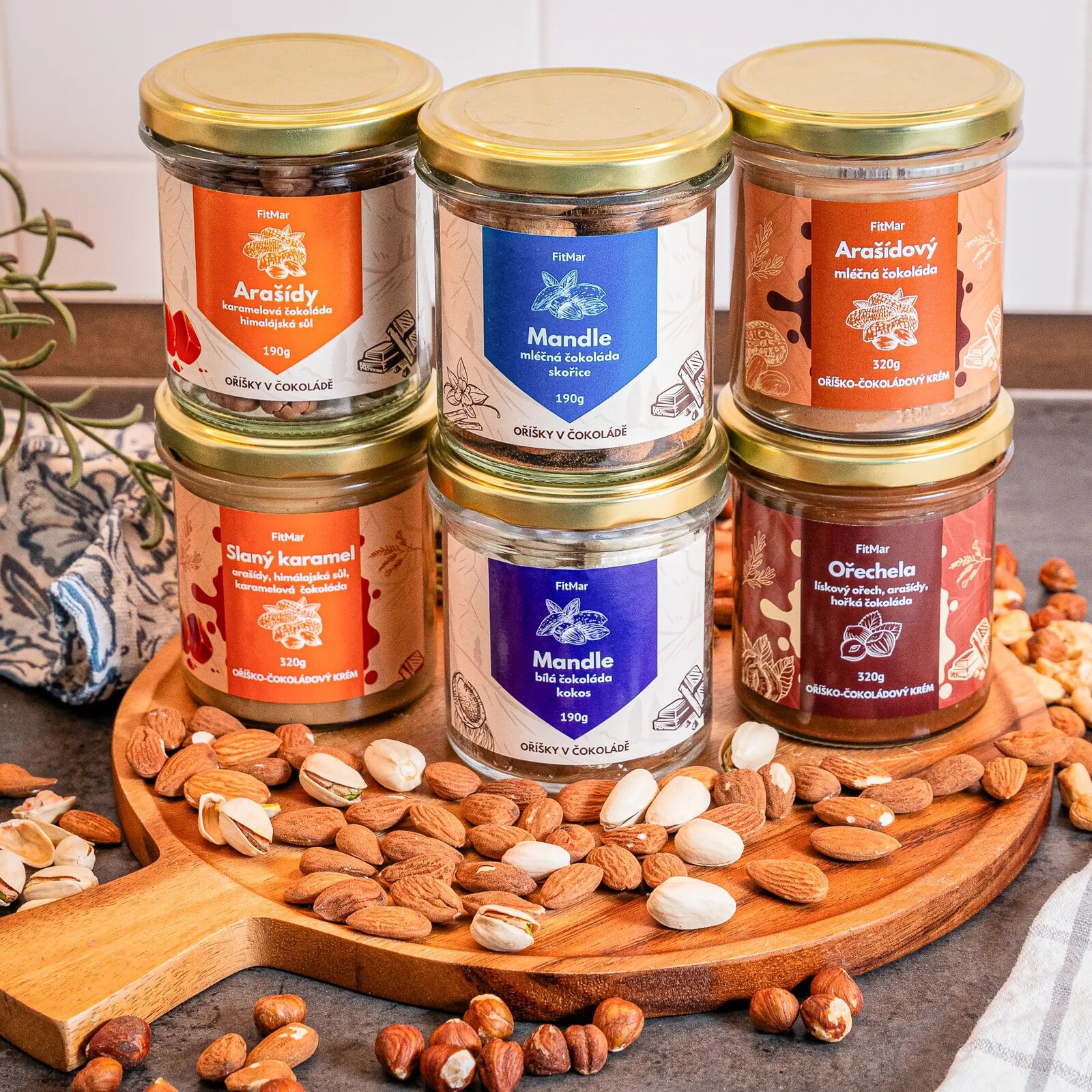 Za krémy nás v balíčku reprezentuje lieskoarašidová Orechela s horkou čokoládou, milovníkov mliečnej čokolády poteší Arašidový krém s mliečnou čokoládou a ako čerešničku na torte sme do balíčka pridali najpredávanejší arašidový Slaný karamel. Pre fanúšikov orieškov v čokoláde je v balíčku pripravená dvojica mandľových favoritov – Mandle v bielej čokoláde a kokose a Mandle v jemnej mliečnej čokoláde a škoricu, ktoré dopĺňajú obľúbené arašidy v karamelovej čokoláde s himalájskou soli.