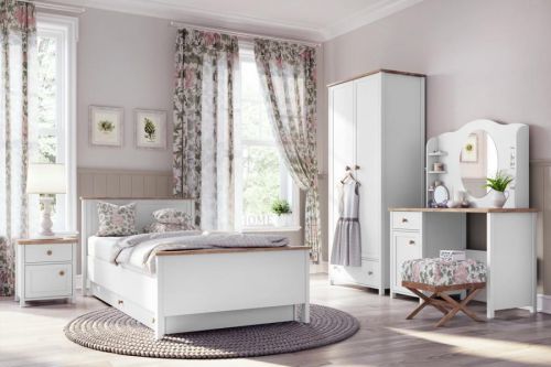 Single spálňa STOORI je v štýlovom prevedení s nádychom romantiky. Tento unikátny nábytok v svetlom prevedení rozžiari Vaše bývanie a opticky ho zväčší. Biely nábytok je doplnený prvkami vo farbe dub nash. Tie nenásilným spôsobom zvýrazňujú jemné línie nábytku. Korpus nábytku je vyrobený z kvalitnej LTD dosky - 16 mm hrúbky. Predné časti nábytku sú vyrobené z LTD dosky s lepeným MDF pásom - 16 mm hrúbky. Vrchné dosky sú z LTD dosky vo farbe dub nash - 22 mm hrúbky. Zadná stena nábytku je z drevovláknitých HDF dosiek 3mm. Jednoduché úchyty sú z plastu vo farbe dub nash.Vodiace lišty na zásuvke majú ložiskovú vodiacu lištu.Spálňa STOORI sa skladá z:1. Praktická dvojdverová šatníková skriňa STOORI SO 01 s 1 šatnou tyčou na vešanie šatstva a praktickou zásuvkou. Rozmery (š/v/h): 85 x 186 x 52 cm.2. Posteľ STOORI SO 08, ktorá ponúka spaciu plochu 90 x 200 cm. Jej súčasťou je rošt aj bonellový matrac s výškou 18 cm. Ku posteli si môžete doobjednať praktickú úložný box STOORI 09, ktorý nie je súčasťou zostavy.3. Kombinovaný nočný stolík STOORI SO 07 so šuplíkom s dvierkami. Rozmery (š/v/h): 45 x 51 x 42 cm.4. Písací stôl STOORI SO 03 s dvierkami a šuplíkom. Rozmery (š/v/h): 110 x 76 x 52 cm.5. Kozmetický nadstavec STOORI SO 06 so zrkadlovou plochou. Po stranách sú malé poličky, kde si môžete umiestniť kozmetiku či šperky. Rozmery (š/v/h): 94 x 81 x 14 cm.Nábytok