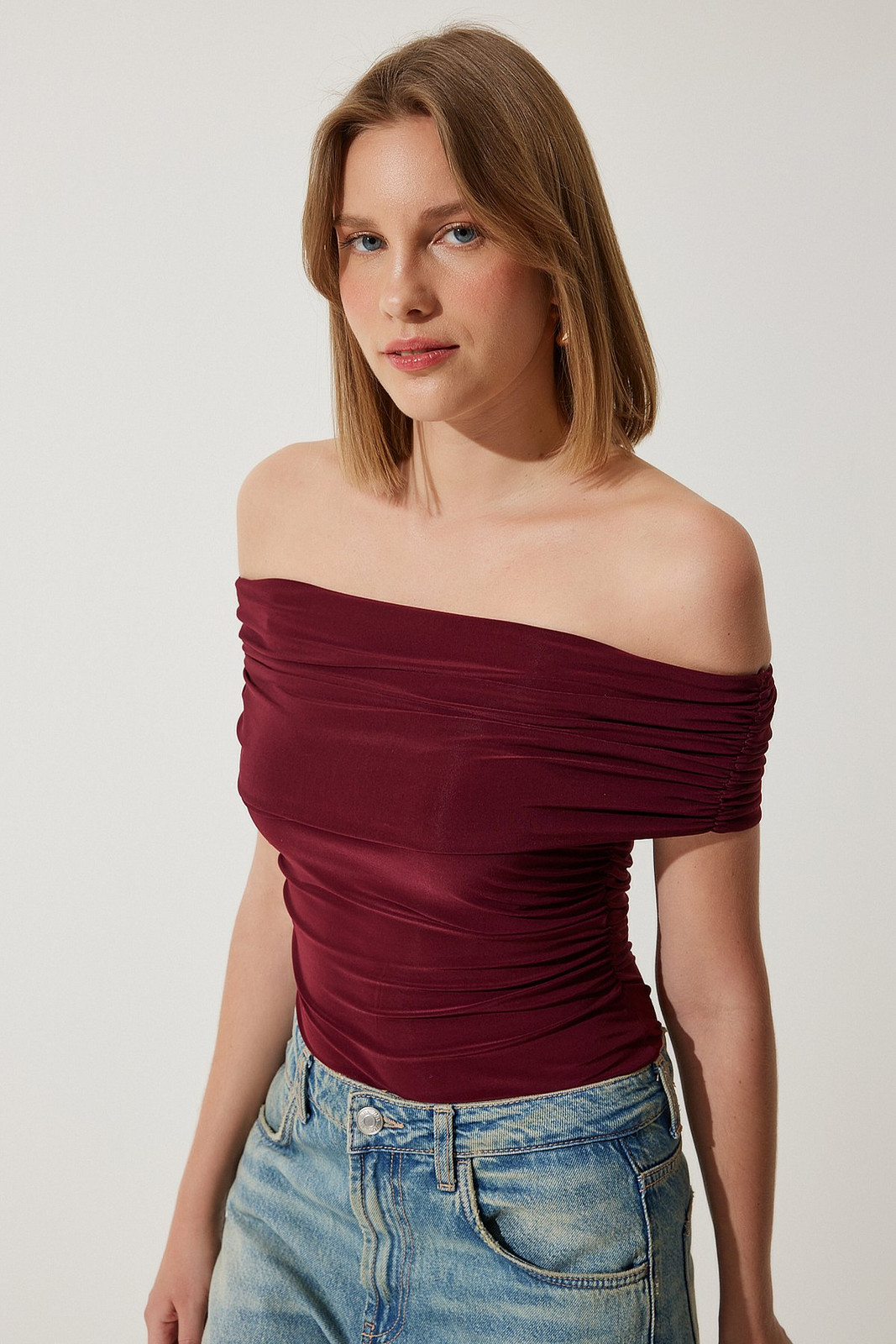 Happiness İstanbul Women's Burgundy Gathered Open Shoulder Sandy Blouse