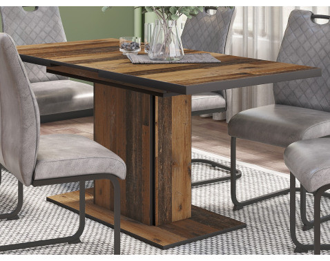 Obdĺžny jedálenský stôl o veľkosti 120x80 cm má stabilnú stredovú podnož a vďaka rozkladacej funkcii je možné jedálenskú dosku rozšíriť na 160 cm. Vyrobený vo vintage optike drevených lát a doplnený čiernym lemovaním.