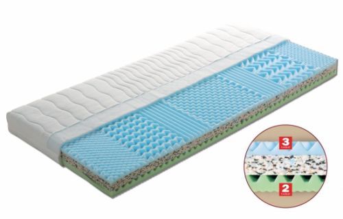 Sendvičový matrac s jadrom zo spájaného polyuretánu. Nosné vrstvy matraca tvorí polyuretánová / PUR pena tvarovaná do masážnych zväzkov a profilovaná vrstva polyuretánu zabezpečujúca prevzdušnenie matraca. Tento matrac sa radí do tzv. Partnerských matracov, ktoré umožňujú výber tuhosti 2 a 3.Celková výška matraca je cca 14 cm.Nosnosť: do 110 kgTuhosť: stredná (2) a tvrdá (3)klinicky testovanéPoťah matraca je snímateľný.Výber poťahov matraca:úplet:Vyšší stupeň kvality v porovnaní s froté poťahom. Povrch je hladšia a silnejšia. Je prešitý dutým vláknom s vyššou gramážou. Týmto spôsobom dosiahneme lepšiu izoláciu od jadra matraca. Tento poťah je prešitý trojzónovým spôsobom (stred - hustejšie prešitie).Aloe Vera:Kvalitný poťah, ktorý obsahuje výťažok známej rastliny Aloe Vera barbaensis z rodu ľaliovitých. Má pozitívny vplyv na pokožku ľudského tela, pôsobí antibakteriálne. Postupne sa uvoľňujúce extrakt z AloeVera umožňuje dokonalú relaxáciu v spánku. Poťah, prešitý trojzónovým spôsobom, je príjemný na dotyk a štandartne votkané logo zaručuje nezameniteľnosť výrobkuSilverguard:Silverguard je jedinečná technológia, ktorá zaručuje trvalú sviežosť a hygienu počas spánku. Eliminuje baktérie spôsobujúce zápach a chráni pred ich usadzovaním. Ochrana je trvalá aj po častom praní a čistení. Pri kontakte s pokožkou zachováva jej prirodzenú rovnováhu. Tento