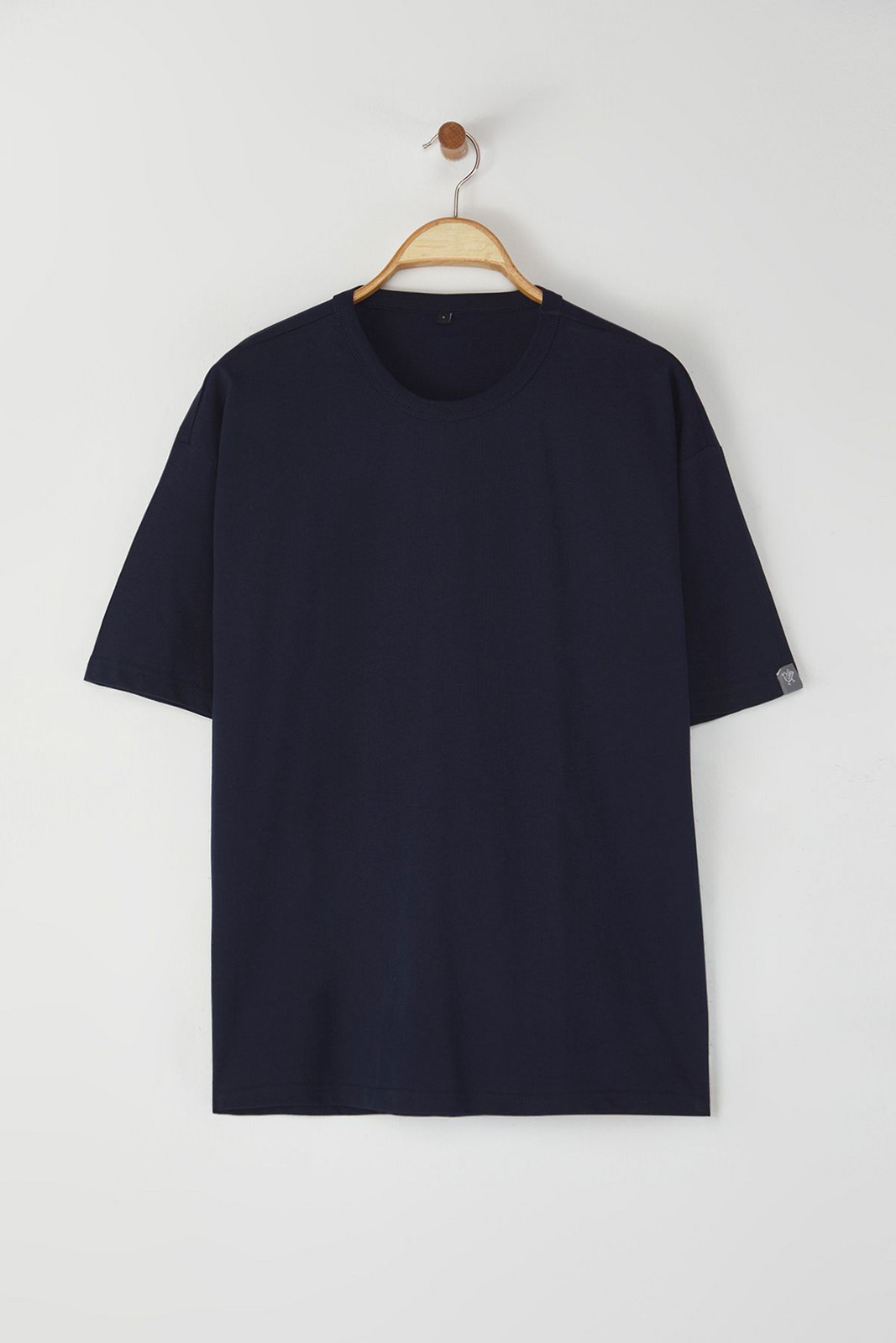 Trendyol Navy Blue Oversize/Wide Cut Collar Detailed Tagged 100% Cotton T-Shirt