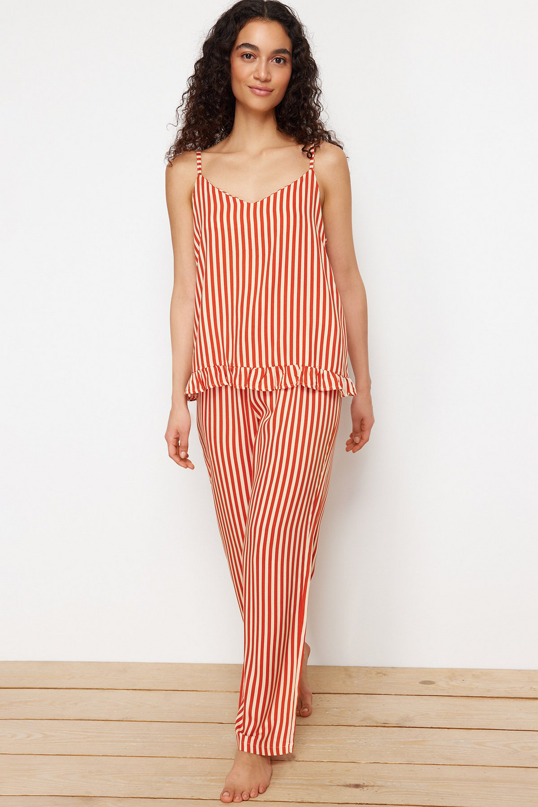 Trendyol Orange-Multi-Colored Striped Ruffle Detailed Viscose Woven Pajama Set with Rope Straps