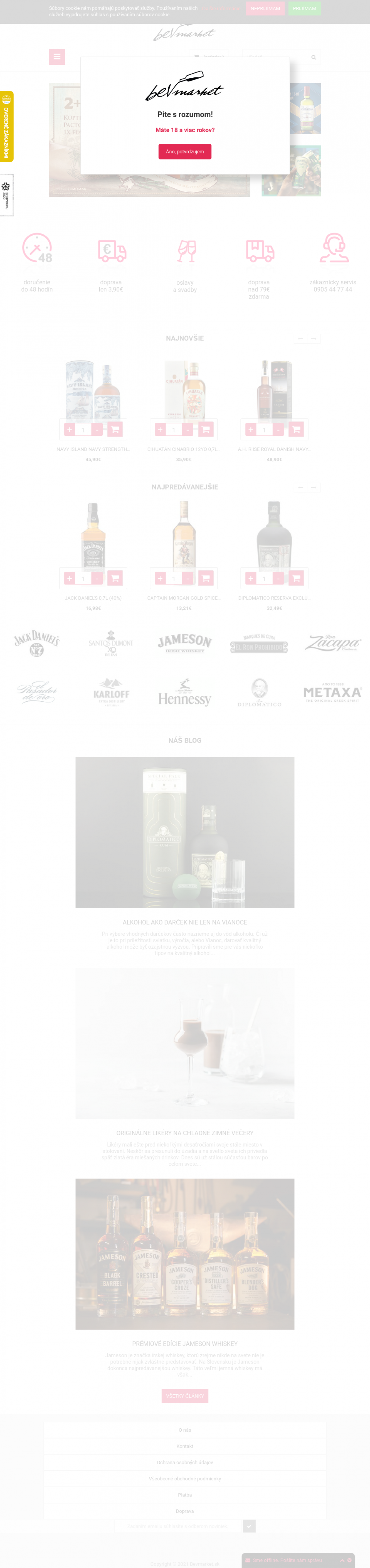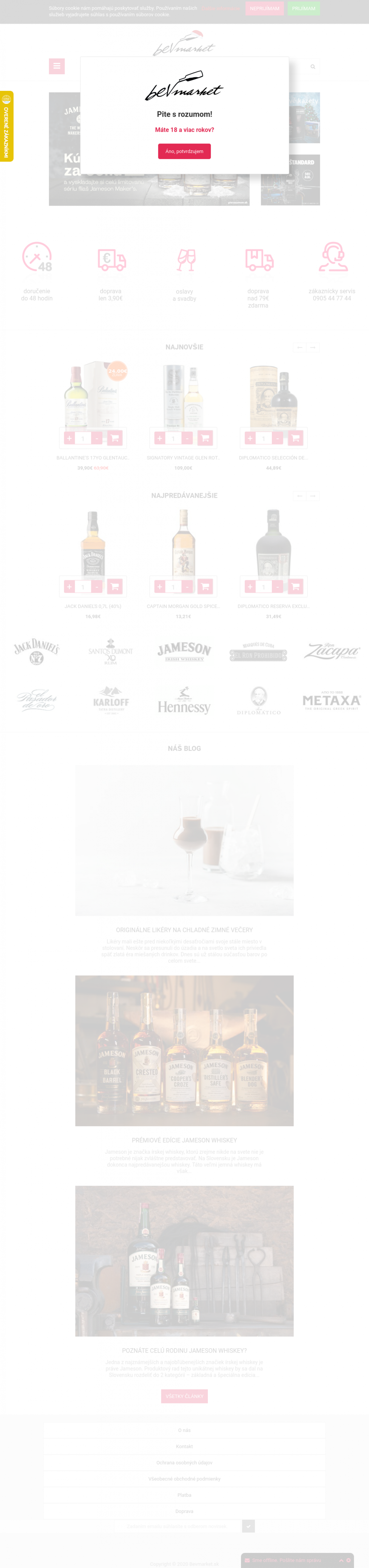 E-shop Bevmarket.sk s ponukou kvalitného značkového alkoholu. Whisky, Gin, Rum, Vodka, Tequila, Cognac, Absinth, Bitter a viac., značiek ako Jack Daniels, Hennessy, Jameson, Emperor, Ron Zacapa, Diplomatico, Captain Morgan a ďalšie.