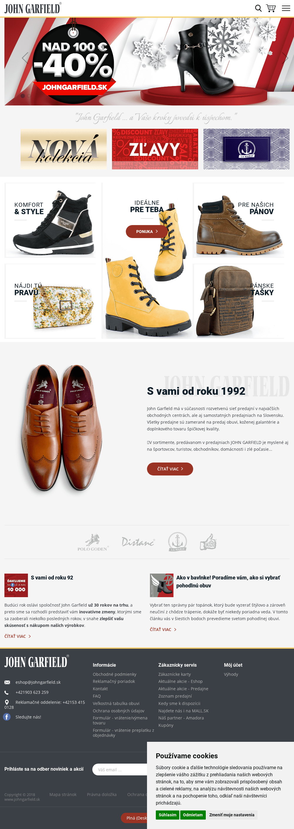 Internetový obchod JohnGarfield.sk ponúka značkovú obuv vysokej kvality s charakteristickým špičkovým dizajnom, pohodlnosťou i módnou farebnosťou vo veľmi prijateľných cenách. Kolekciu obuvi vhodne dopĺňa široká škála koženej i nekoženej galantérie, cestovných tašiek, kufrov, opaskov a peňaženiek.