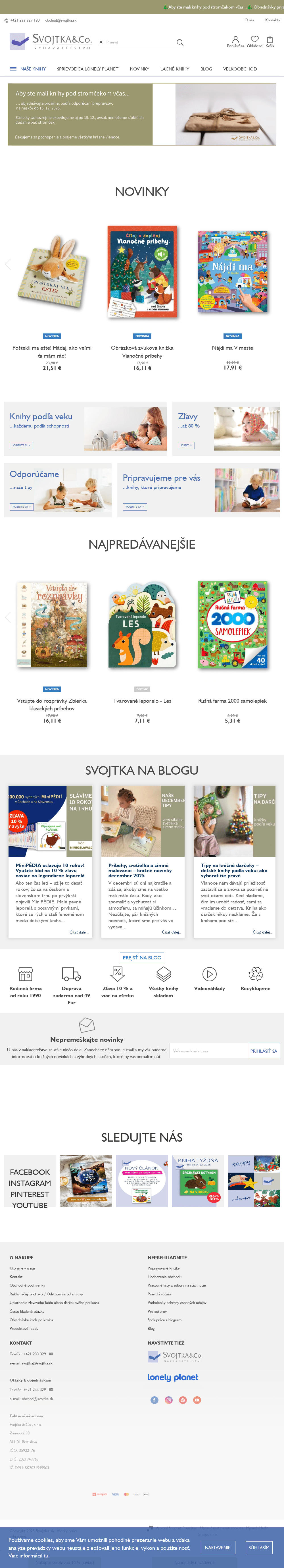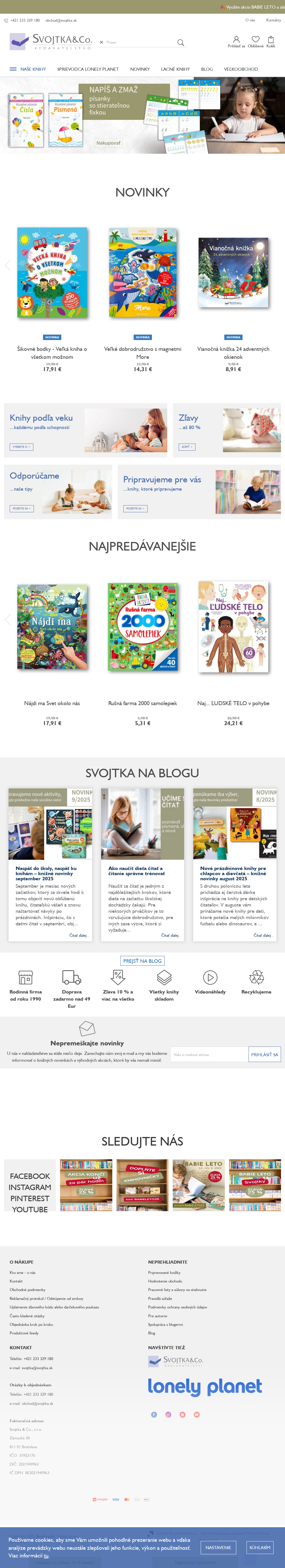 Vydavatel'stvo Svojtka & Co. Encyklopédie pre deti i dospelých, atlasy, militáriá, ale aj knihy o cestovaní, zvieratách, rastlinách, hudbe a umení, kuchárky, hry a testy pre mládež, široké spektrum kníh pre predškolákov a školákov, knižky pre voľný čas a mnoho ďalších. Velmi obľúbená je svetovo známa edícia sprievodcov Lonely Planet.