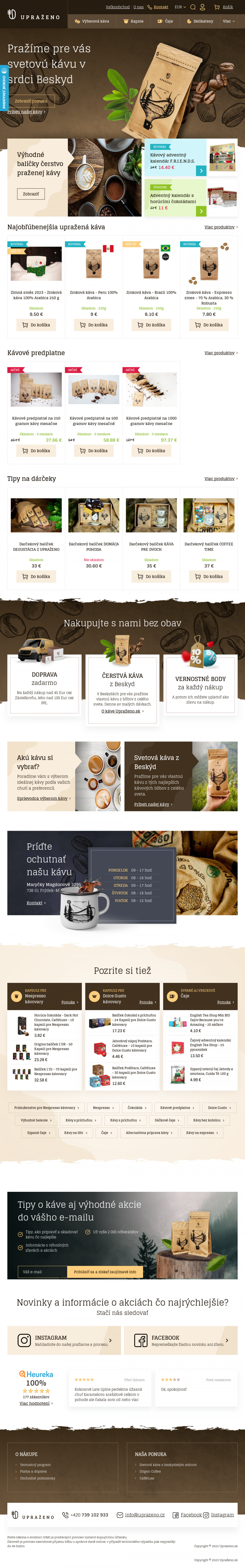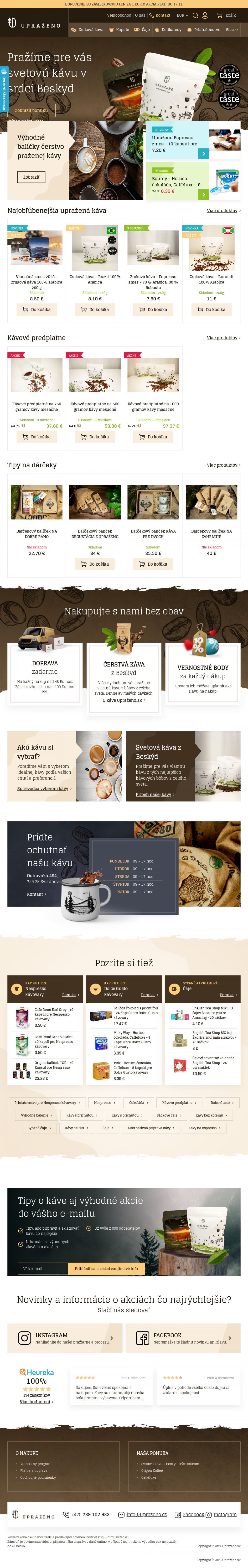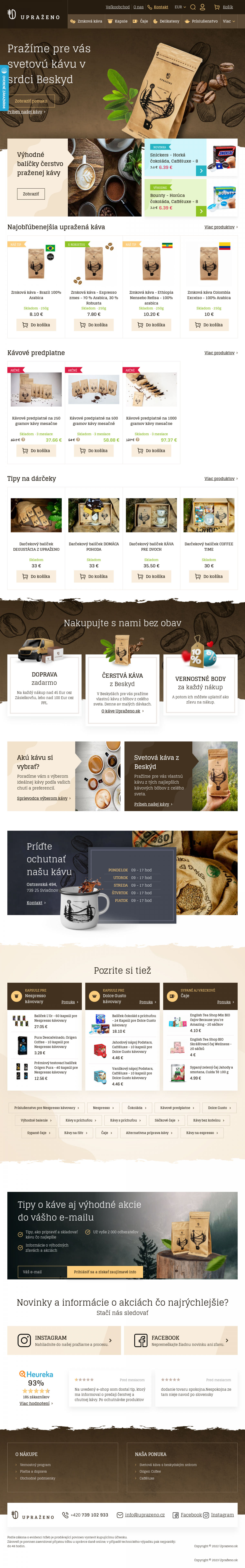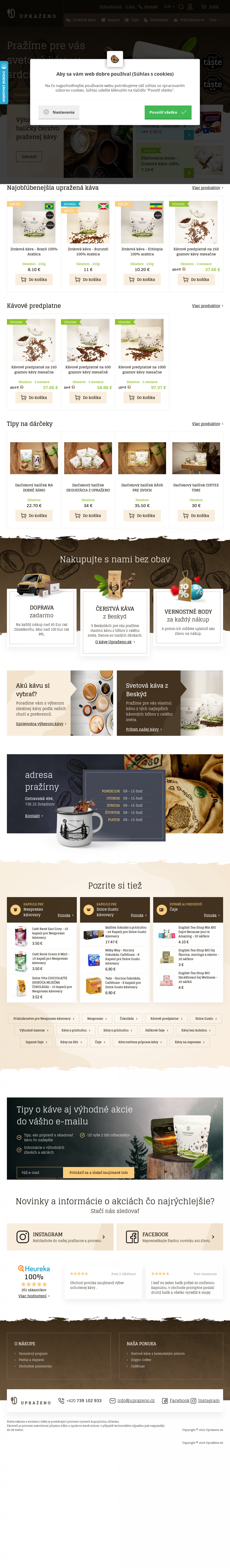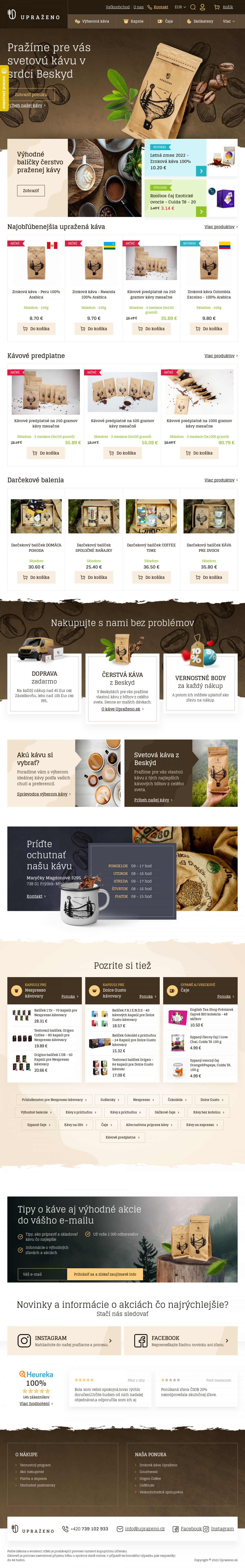 Zrnková káva Upraženo. Kapsule pre NESPRESSO. Kapsule pre DOLCE GUSTO. Široký výber čajov. Príslušensto pre prípravu kávy a ďalšie.