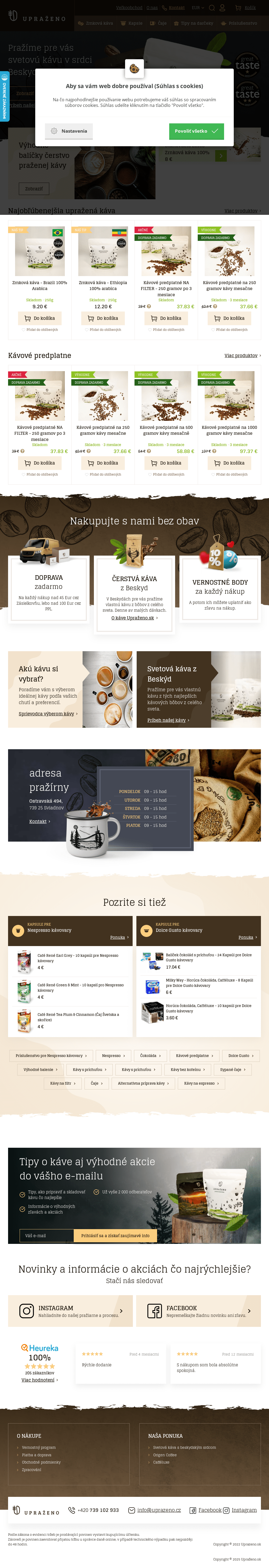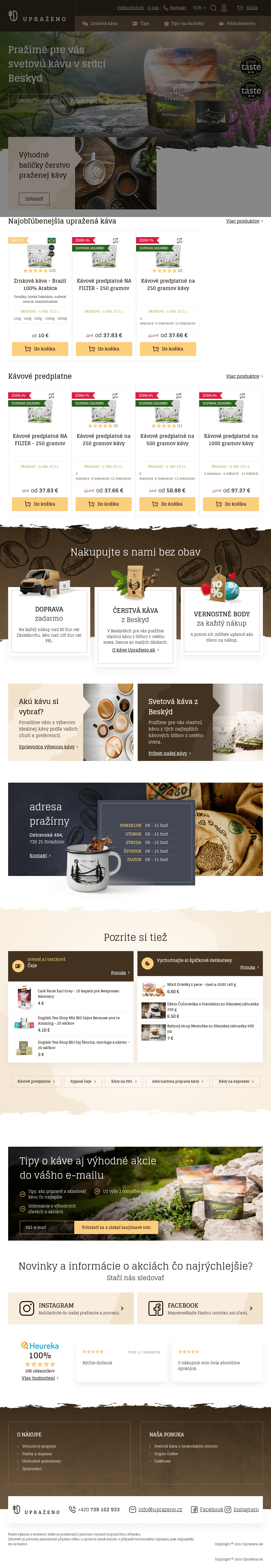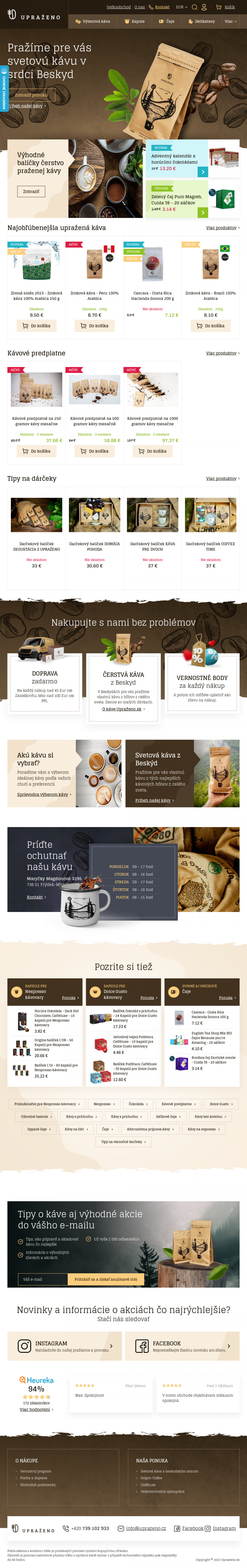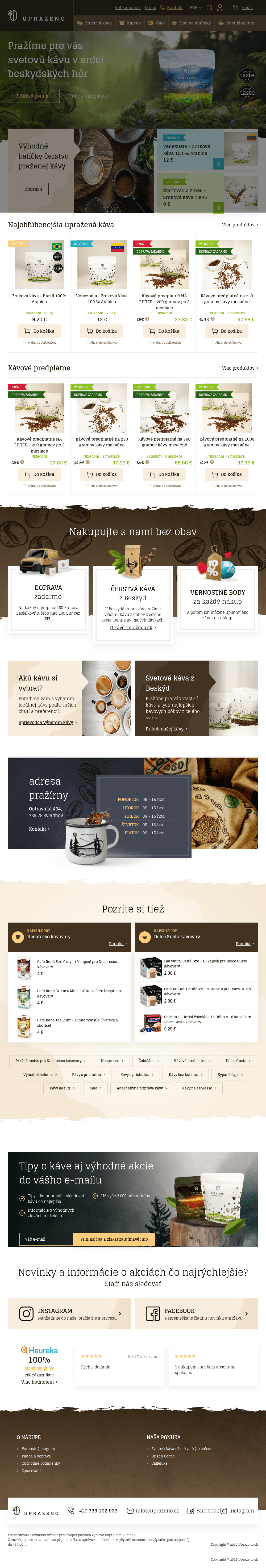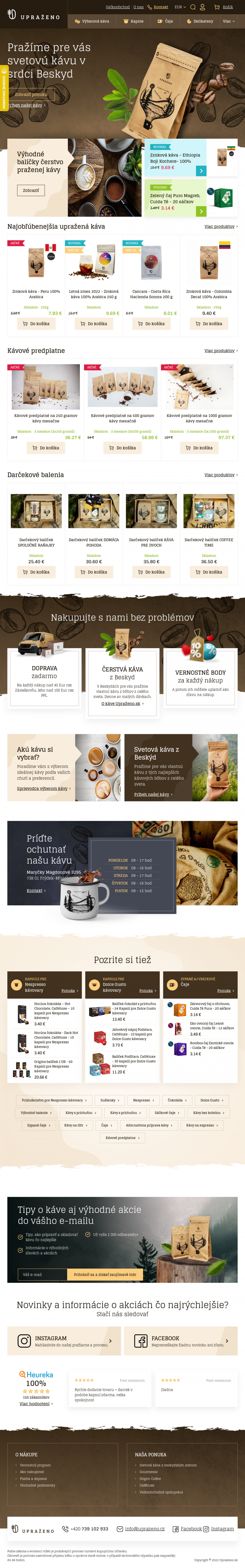 Zrnková káva Upraženo. Kapsule pre NESPRESSO. Kapsule pre DOLCE GUSTO. Široký výber čajov. Príslušensto pre prípravu kávy a ďalšie.