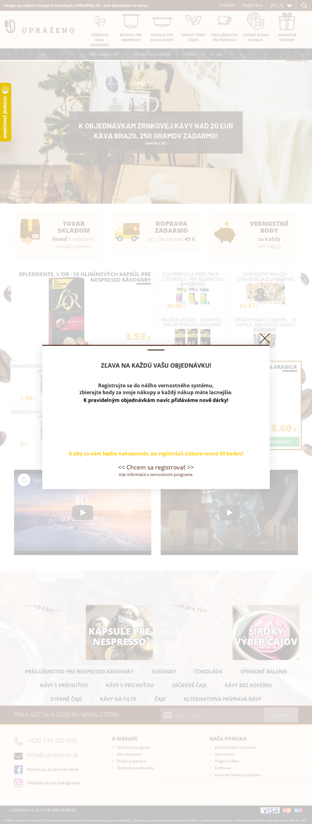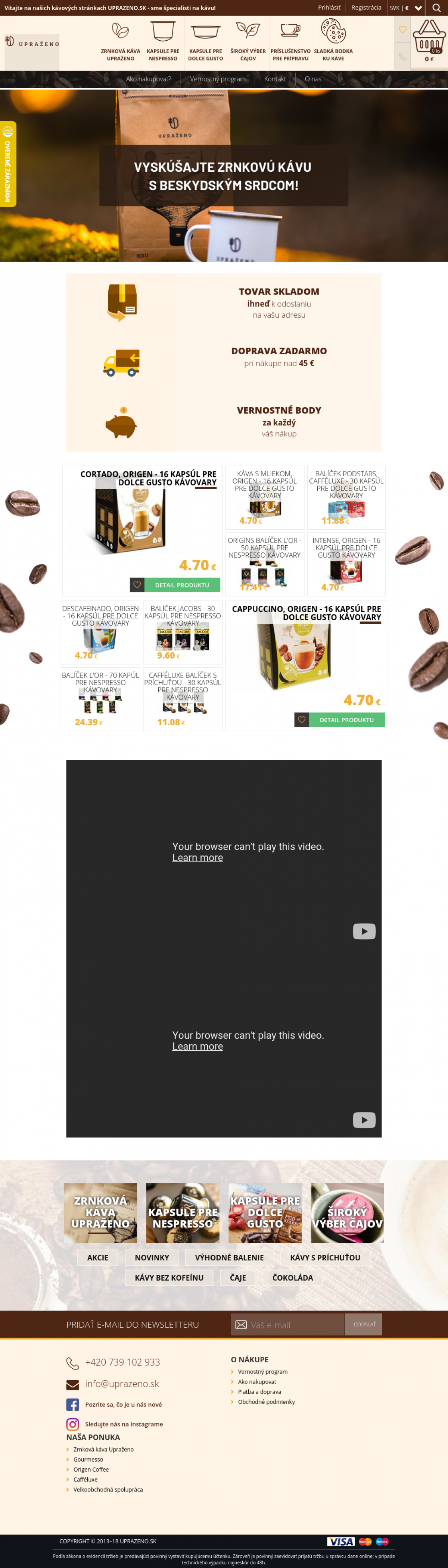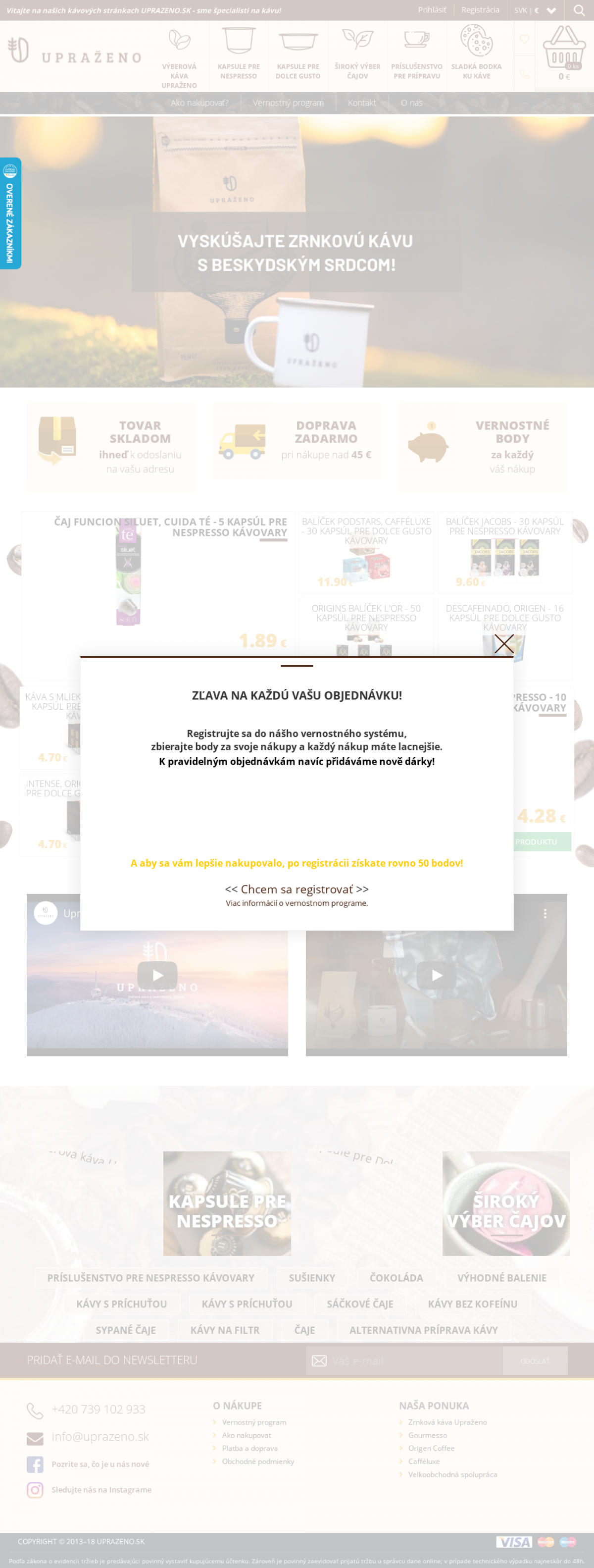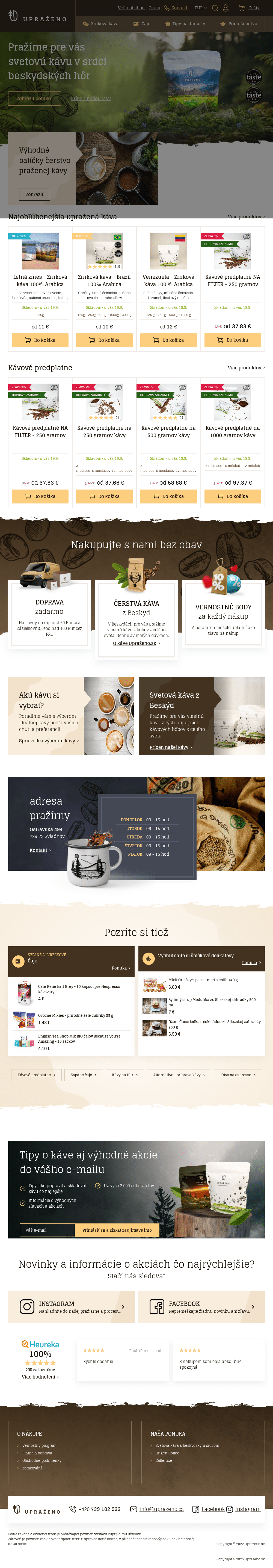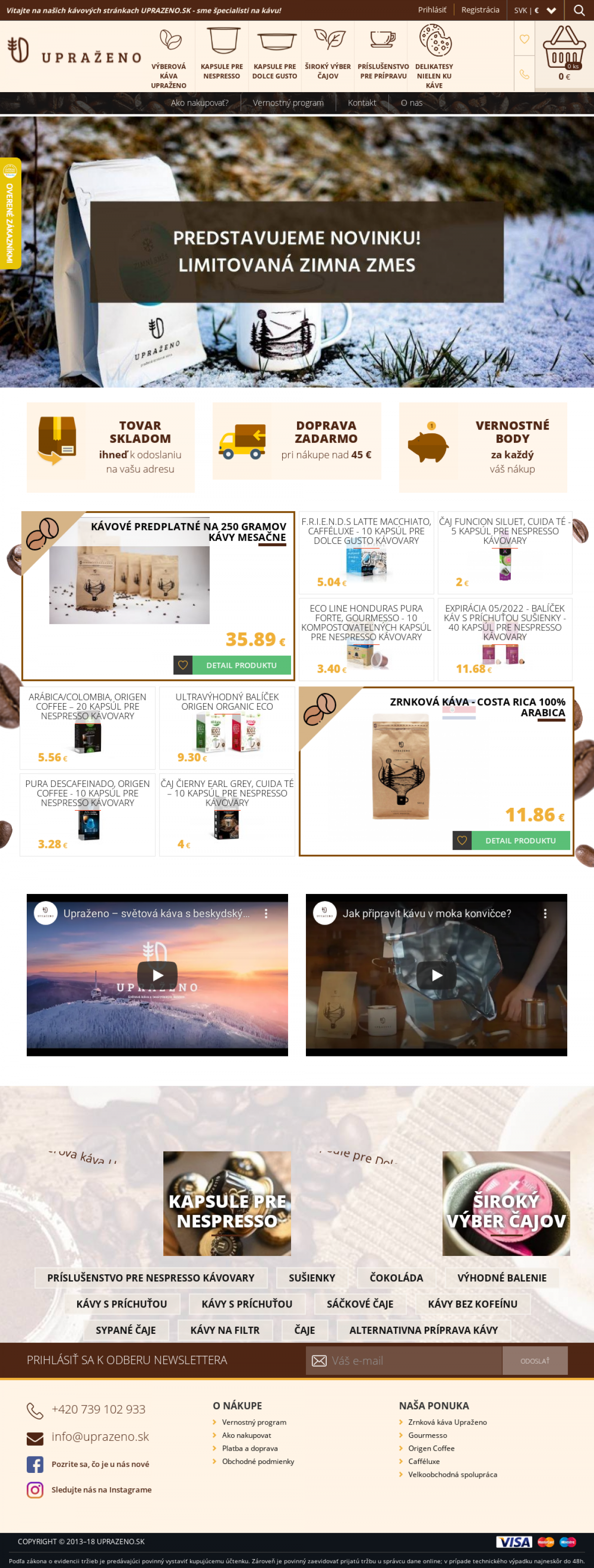 Zrnková káva Upraženo. Kapsule pre NESPRESSO. Kapsule pre DOLCE GUSTO. Široký výber čajov. Príslušensto pre prípravu kávy a ďalšie.